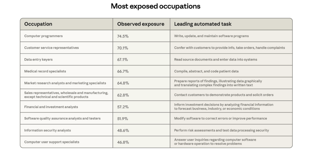 巧的是,Anthropic 自己的劳动力报告里也有一张表格单独列出这些职业,其中计算机程序员暴露度达 74.5%,客服代表 70.1%,数据录入员 67.1%,病历专员 66.7%。