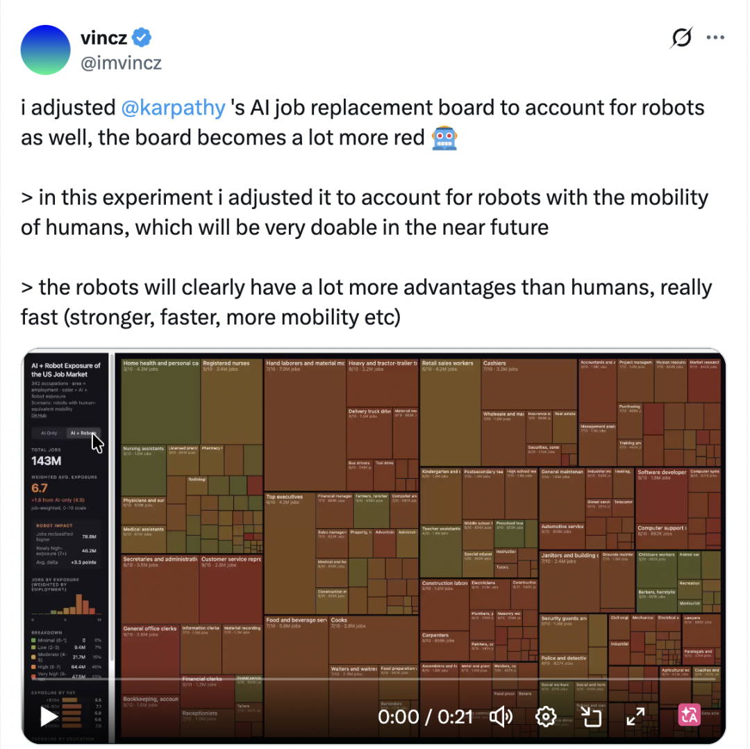 有网友在 Karpathy 原版图表的基础上加入了机器人因素,整张图变得更红了。屋顶工人、清洁工、建筑工人、水管工、电工——他们面对的是一套完全不同的自动化威胁:机器人技术、自动驾驶和仓储自动化,正在慢慢逼近。