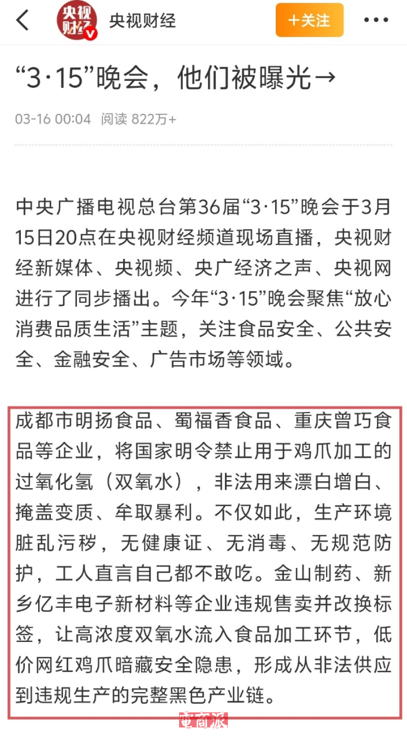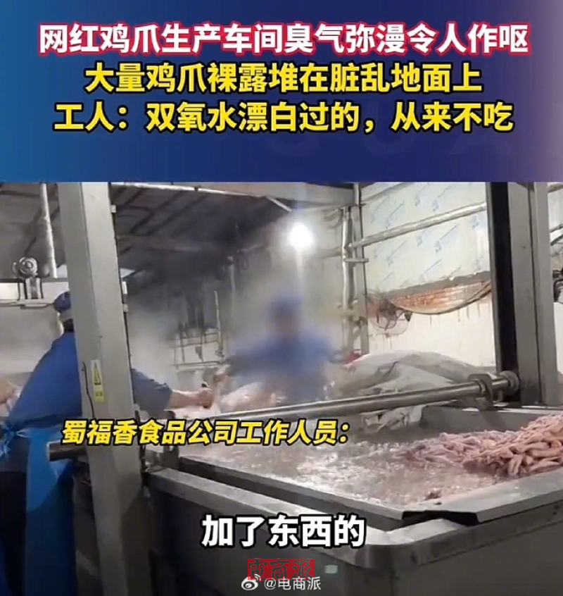 今年315期间,泡椒凤爪行业也集体“塌房”,央视315晚会还曝光了泡椒凤爪生产环境脏乱、鸡爪裸露堆放,使用双氧水进行非法漂白处理等乱象,成都市明扬食品、蜀福香食品、重庆曾巧食品等企业被直接点名。