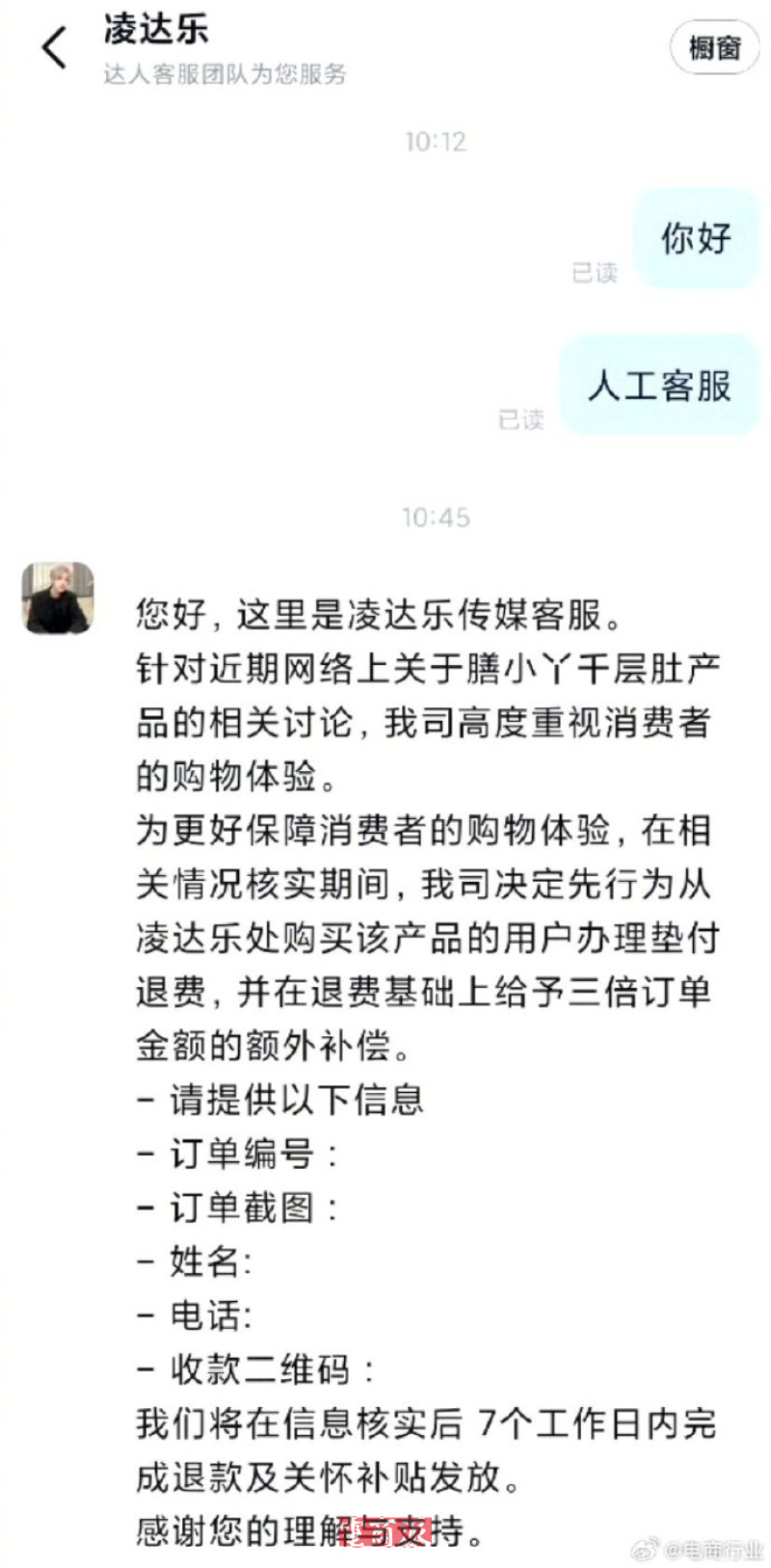 与此同时,3月16日,凌达乐传媒的客服也作出回应,称针对近期网络上关于膳小丫千层肚产品的相关讨论,为了更好地保障消费者的购物体验,在相关情况核实期间,决定先行为从凌达乐直播间购买该产品的用户,办理垫付退费,并且在退费基础上,给予三倍订单金额的额外补偿。消费者只需提供相关购买信息,就能在7个工作日内收到退款和关怀补贴。