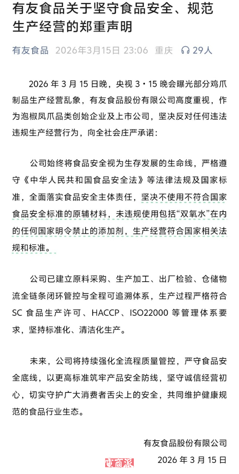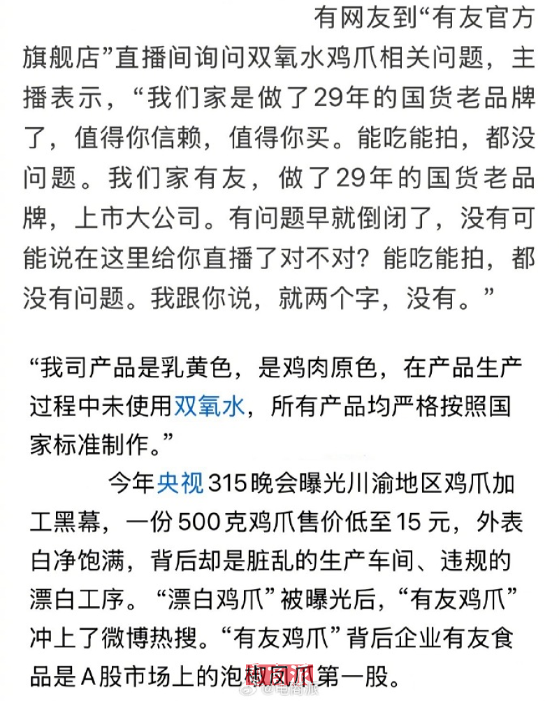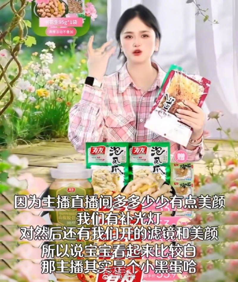 而深陷漂白鸡爪风波的有友主播则表示“鸡爪看起来白,是因为开了美颜、打了补光灯”“要是产品有问题,我们早就倒闭了”。