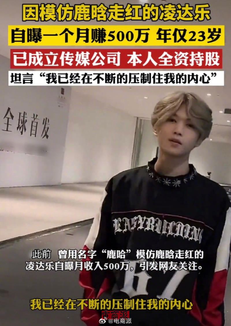 此前,网红“鹿哈”靠模仿鹿晗走红时,曾自曝一个月能赚500万,之后还成立了自己全资持股的传媒公司。