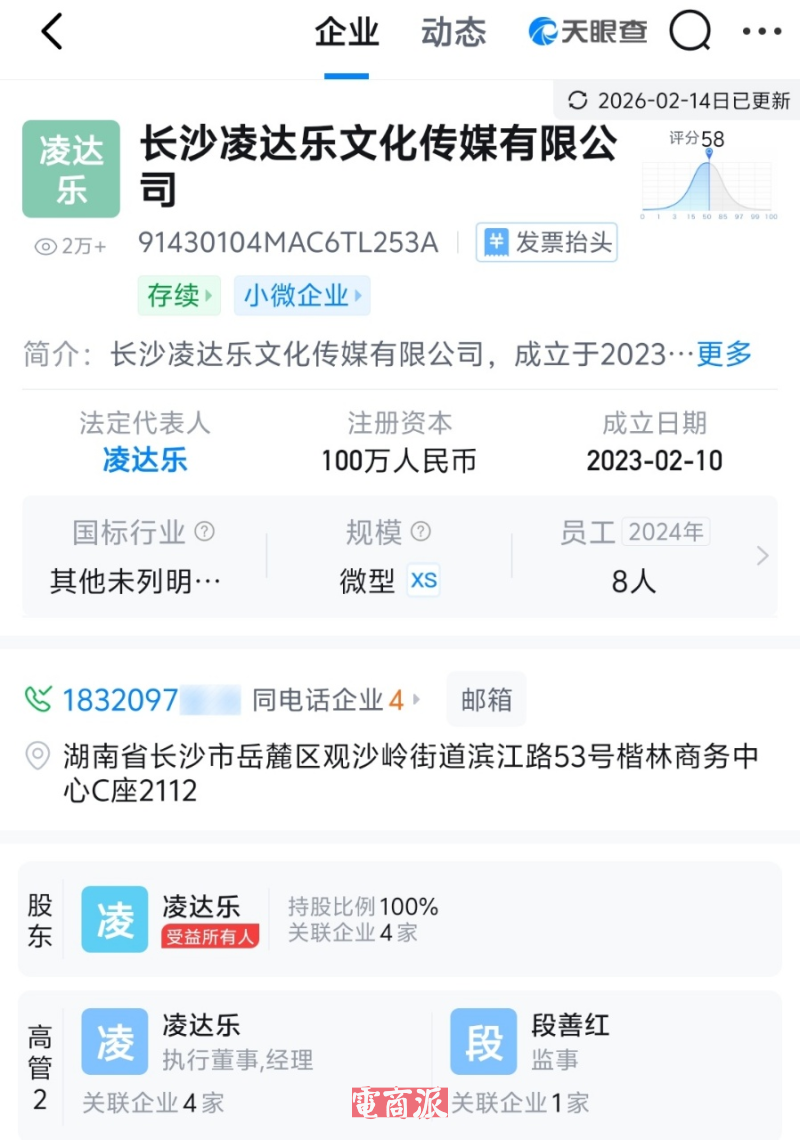 天眼查App显示,长沙凌达乐文化传媒有限公司于2023年2月成立,法定代表人为凌达乐,注册资本100万元人民币,经营范围包括个人互联网直播服务、文化娱乐经纪人服务、摄像及视频制作服务等。